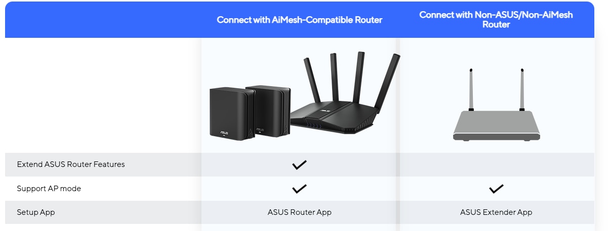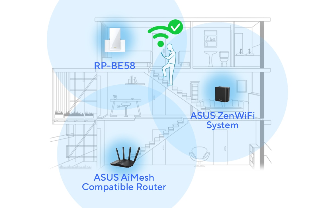 In plus fata de dispozitivele compatibile cu ASUS AiMesh, RP-BE58 poate functiona cu o gama larga de alte routere WiFi, modemuri si gateway-uri. Conectati RP-BE58 la routerul dvs. actual pentru a va bucura de o retea WiFi extinsa!