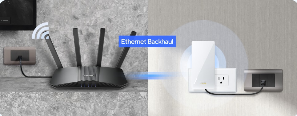 Cand RP-BE58 functioneaza ca nod AiMesh sau in modul Access Point (AP), il puteti conecta pur si simplu la routerul dvs. cu un cablu Ethernet. Acest backhaul rezerva intreaga banda de 2,4 GHz si 5 GHz pentru dispozitivele dvs. wireless, pentru a crea conexiuni mai stabile si mai fiabile.
