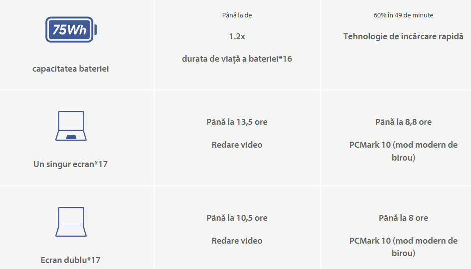 Nu este nevoie sa va panicati daca exista putine prize de curent: Bateria de lunga durata de 75 Wh a modelului Zenbook DUO va poate mentine productiv timp de pana la 8 ore. Iar atunci cand este timpul sa incarcati, nu este nevoie sa incetiniti - in doar 49 de minute puteti ajunge la un nivel de incarcare de 60%. Bateria reproiectata de mare capacitate de 75 Wh are o durata de viata extinsa, ecologica, care suporta cu pana la 20% mai multe cicluri de incarcare decat generatia anterioara.