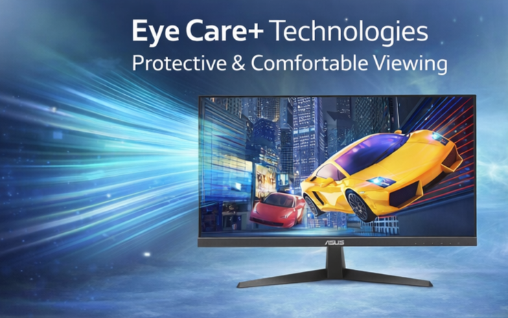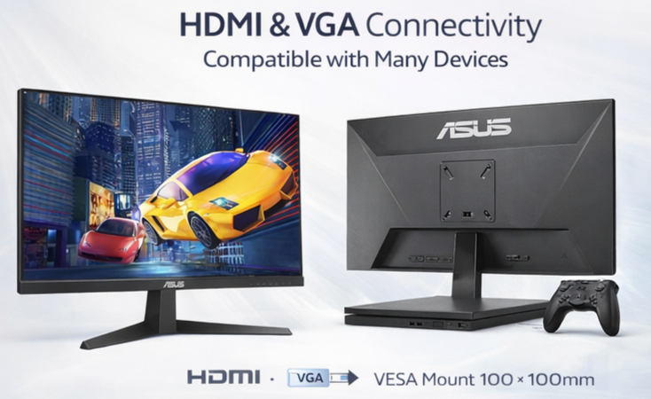 Tehnologiile ASUS EyeCare+ — Flicker-Free, Low Blue Light și tratament antibacterian — reduc oboseala oculară și mențin o experiență de utilizare sigură și confortabilă. Monitorul este echipat cu HDMI și VGA, fiind compatibil cu o gamă largă de dispozitive, de la PC-uri și laptopuri până la console.