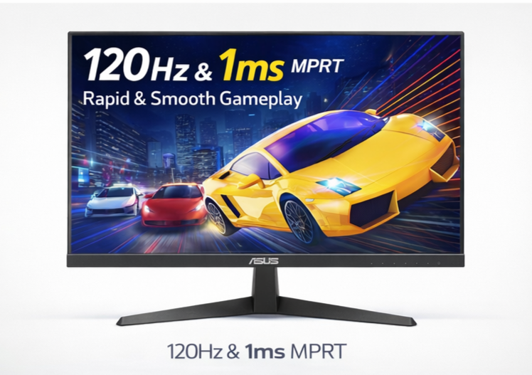 Scenă dinamică cu două mașini sport în cursă printr-un oraș futurist, redată pe monitorul ASUS. Textul „120Hz & 1ms MPRT – Rapid & Smooth Gameplay” evidențiază fluiditatea și viteza de răspuns, ideale pentru jocuri competitive.