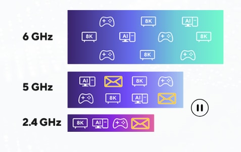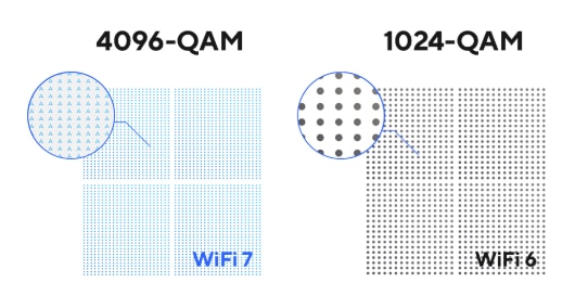 Transmisie eficienta 4K-QAM In comparatie cu 1024-QAM cu WiFi 6/6E, 4096-QAM permite fiecarui semnal sa incorporeze mai dens cantitati mai mari de date, oferind o transmisie de date cu pana la 20% mai eficienta. |