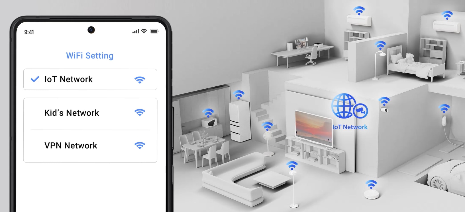 Retea IoT Configurati si gestionati toate dispozitivele IoT sub un singur SSID securizat pentru a beneficia de securitate sporita cu protectie de nivel comercial. |