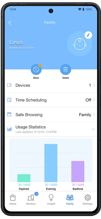Tablou de bord pentru activitatea pe internet Monitorizati utilizarea internetului de catre copiii dvs. prin intermediul unui tablou de bord grafic cuprinzator. Vedeti dintr-o privire timpul petrecut online, consumul de date si activitatea specifica fiecarui dispozitiv. |