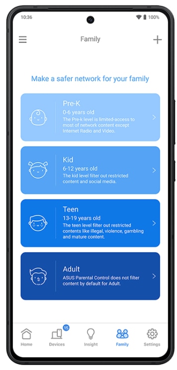 Profiluri prestabilite in functie de varsta Profilurile prestabilite filtreaza automat continutul inadecvat si seteaza programul de utilizare a ecranului, facilitand aplicarea setarilor in functie de varsta copiilor dumneavoastra. |