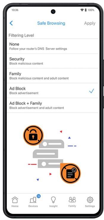 Navigare sigura Personalizati protectia pentru utilizatori individuali sau pentru un grup de dispozitive cu filtre de siguranta pentru a securiza activitatile online. |
