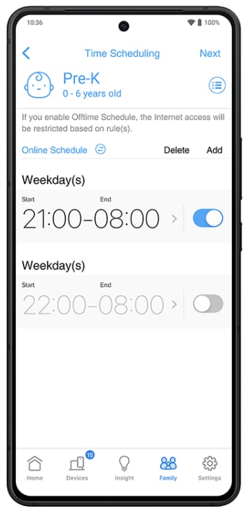 Programare flexibila a timpului Definiti orele online si offline pentru fiecare copil, asigurand un timp echilibrat petrecut in fata ecranului si promovand obiceiuri digitale sanatoase. Recompensati comportamentul bun cu timp suplimentar online, ca intarire pozitiva. |