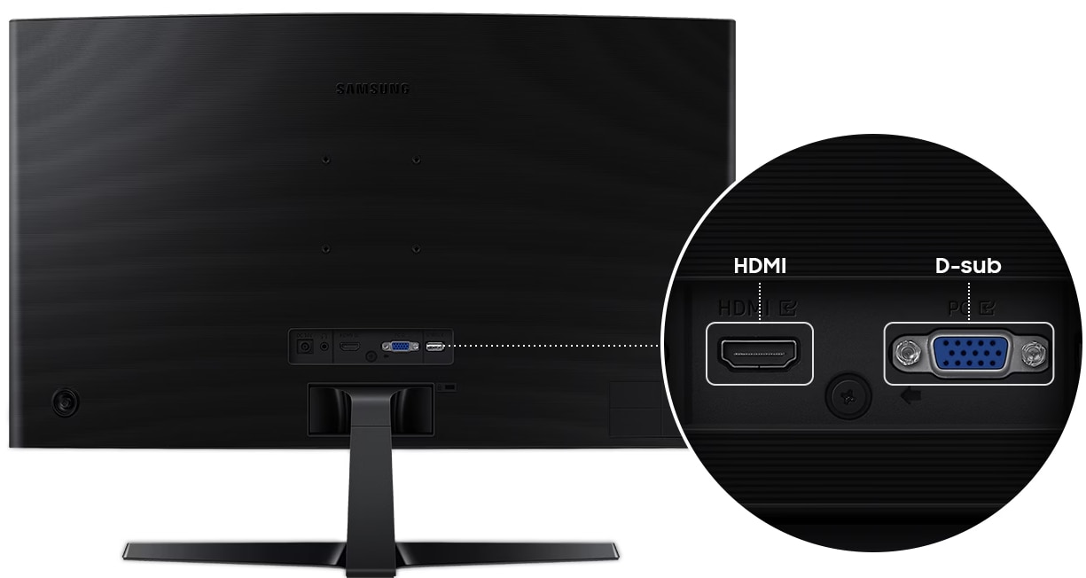Monitorul oferă un port HDMI 1.4 și un port VGA (D‑Sub), plus ieșire audio jack 3.5 mm.